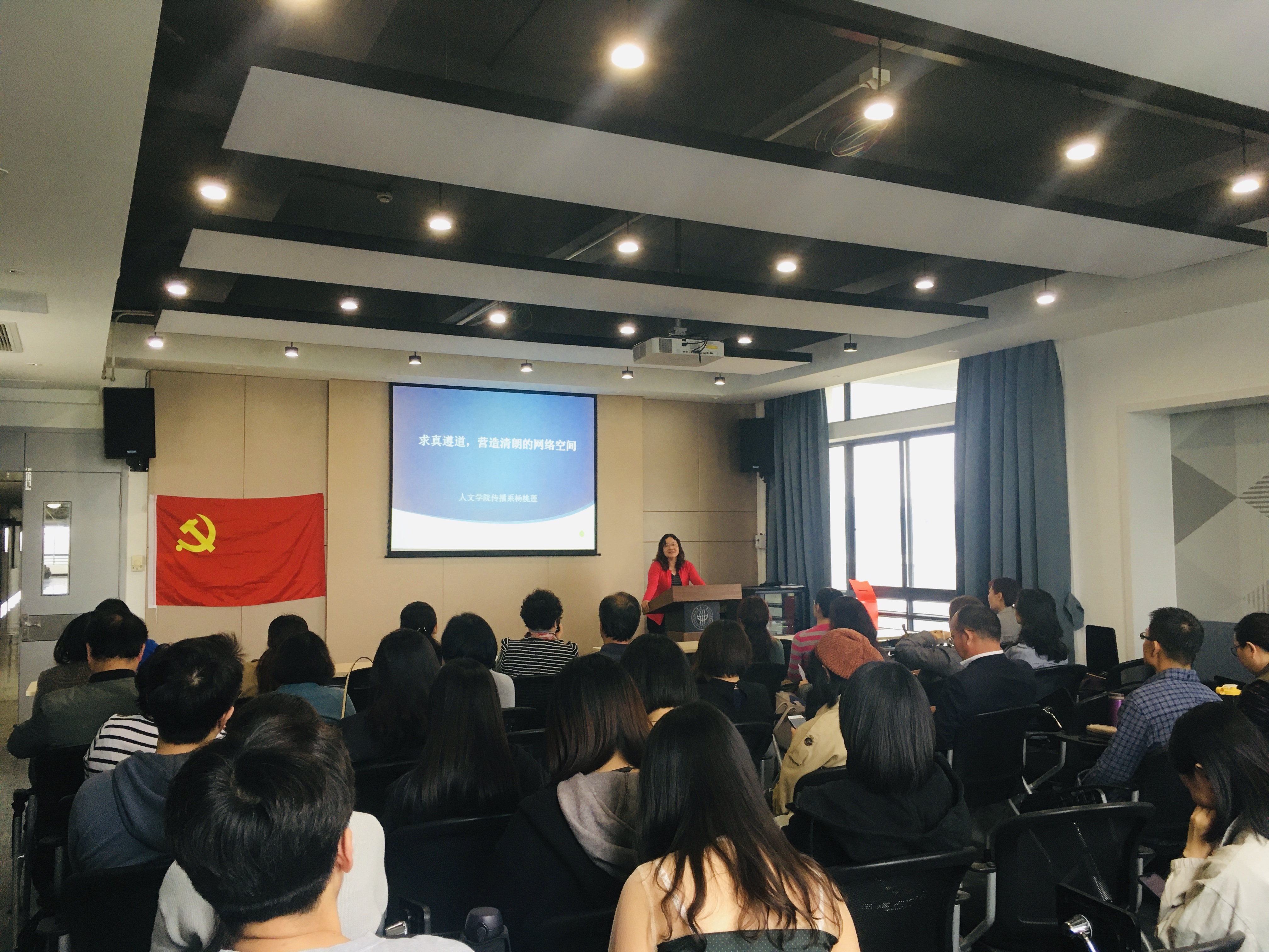 杨桃莲结合自己丰富的教育教学经历,从伦理角度出发,与在座师生党员分享了如何营造清朗网络空间的相关思考。她深入浅出地阐释了习近平总书记有关互联网建设的重要论述,引用生动详实的案例剖析了网络传播失范现象背后的成因,并从政府、网络平台、网络传播者、网络受众等几个方面提出了建立网络综合治理体系的建议举措。