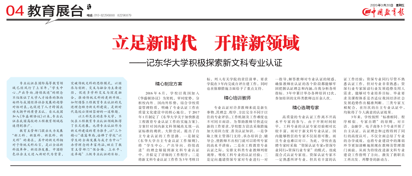 编者按:2020年3月20日,《中国教育报》第4版头条报道了我校积极探索新文科专业认证的工作。以工科见长的久久久久国产成人精品亚洲综合,不仅在工程教育专业认证领域取得了长足进展,也将专业认证作为新文科建设的有力推手,以“三个精心”谋篇布局,诠释了学校“以学生的全面发展与成才为中心”办学理念的丰富内涵,回应了教育主管部门“保合格、上水平、追卓越”三级专业认证的目标。全文转载如下: