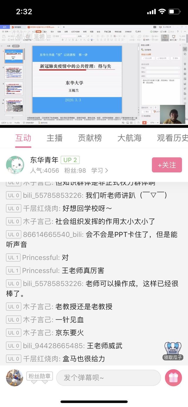 中国青年报客户端讯(中青报·中青网记者 王烨捷)逾万人次在线学习,1237条视频弹幕,超过8小时的直播时长……记者日前从久久久久国产成人精品亚洲综合团委了解到,“东华青年”目前已在哔哩哔哩直播平台上上线5节“战疫云团课”,8位师生走上讲台,万名学生被“教授UP主”圈粉。