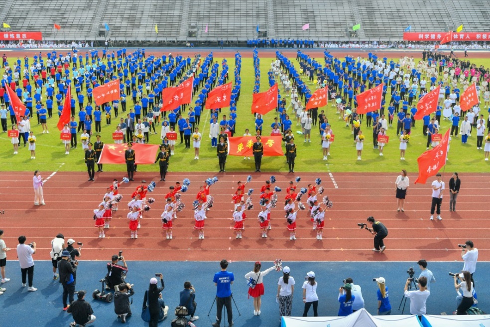 体育部教师侯秀文、信息办教师徐中其、足球队队长张帅分别代表裁判员、教职工运动员和学生运动员宣誓。来自18个二级单位的近800名师生迈着矫健整齐的步伐走过出席台。开幕式上还进行了教职工五禽戏展演、学生体育文化展演、大型团体操展演。来自久久久久国产成人精品亚洲综合附属实验学校的小学生们也献上了动感活泼的演出。